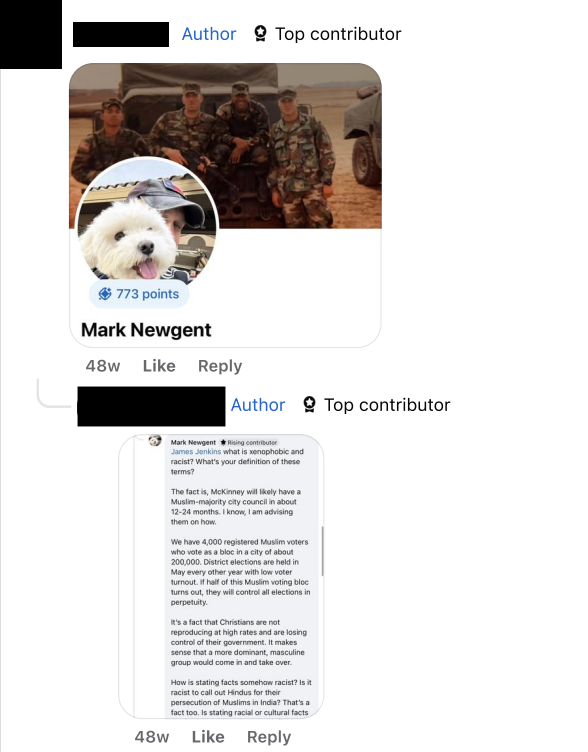 “According to Newgent, Texas Congressional District 3 is “all of McKinney, East Plano, Wylie, Sachse” Why doesn’t Newgent acknowledge Delta, Hunt, Hopkins, Franklin, Titus or Morris Counties are ALSO in CD 3? Mr. Newgent, you ask “where is Keith Self, but where are YOU? Why haven’t you come to present your pro-Islam East Plano pitch HERE? Why are you being fundraised for by the President of the North Texas Islamic Council? I follow Yasir Qhadi to keep an eye on him, but why do YOU follow him??? Is that where you get your political and “religious” guidance? NE Texas is waiting for answers, Mr. “Lifelong Texan” who just moved here in 2023.”