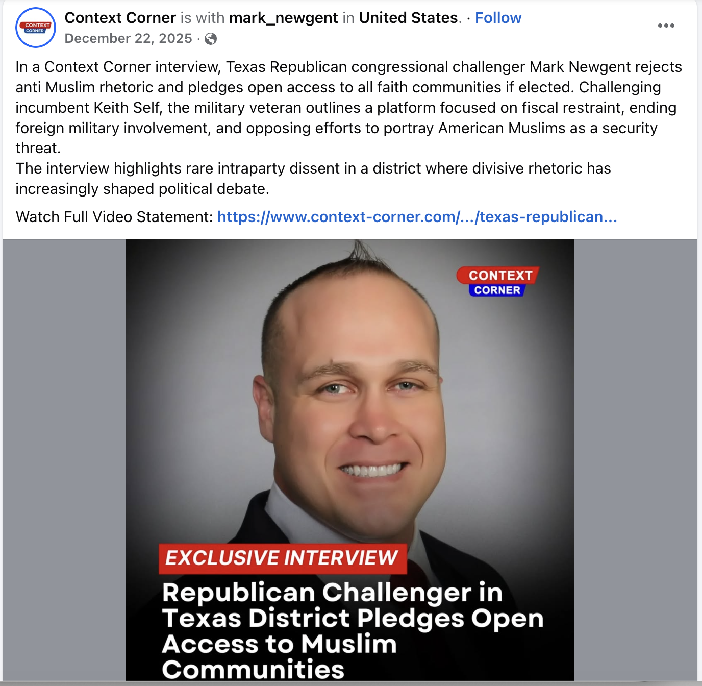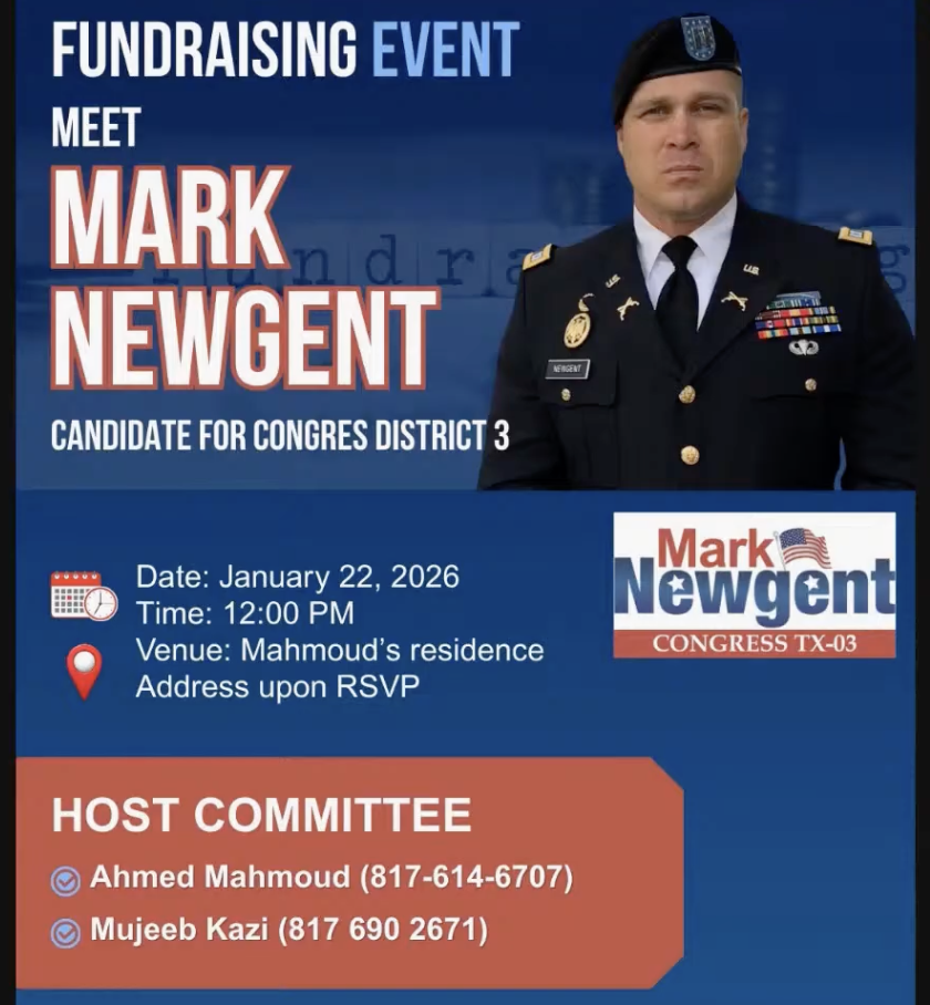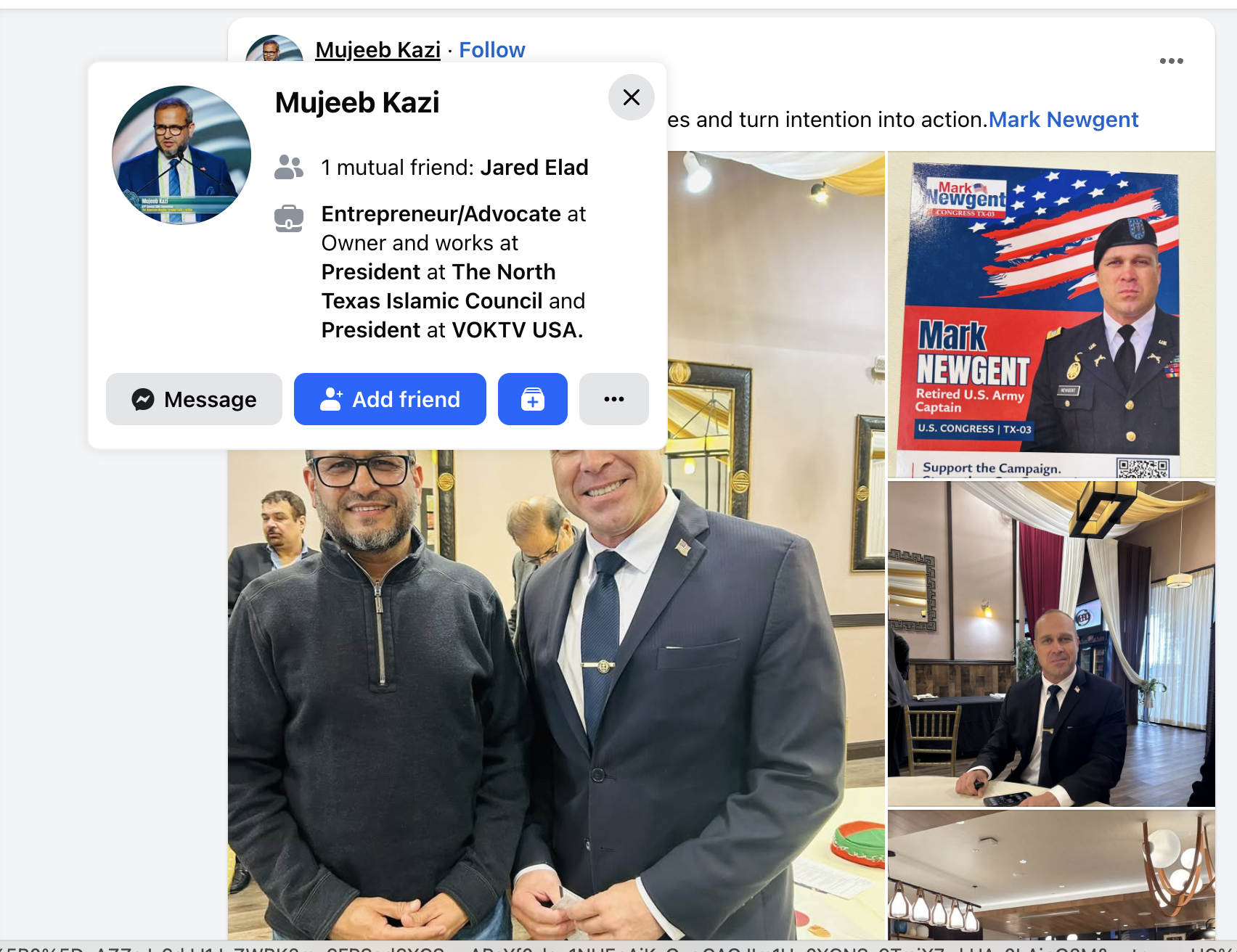 Newgent has appeared in New Saudi (aka East Plano, Texas) and at the East Plano Islamic Center forum. That is a matter of record. Candidates attend forums, and Newgent wasn’t the only “Republican” who attended the East Plano Islamic Center’s bipartisan congressional forum on February 9, 2026. Fine.
